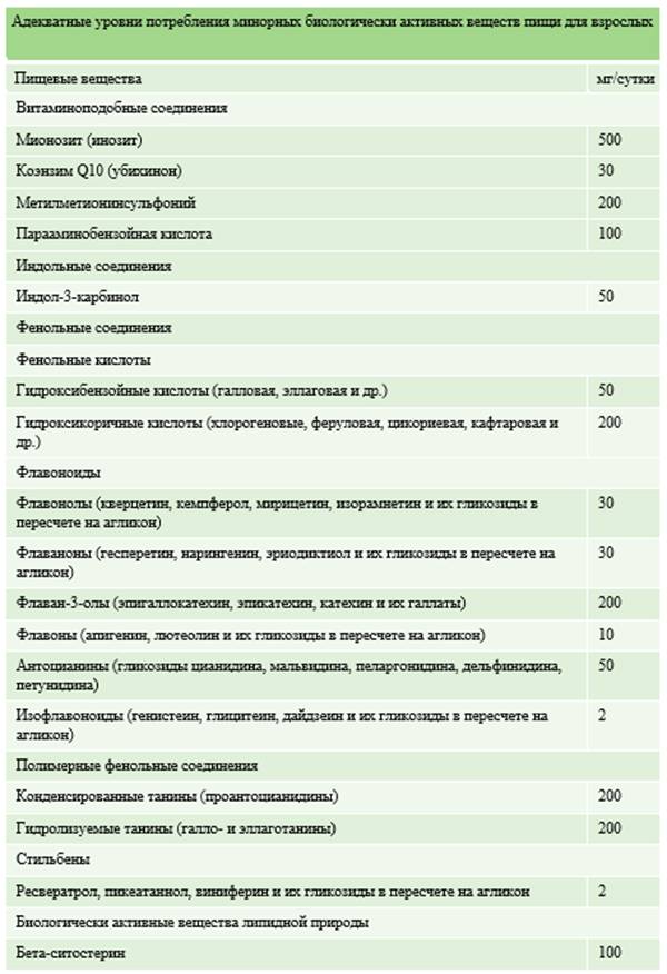 Однако фитохимических веществ существует много, а уровни потребления, которые показали определенный эффект на здоровье, найдены только для небольшого ряда веществ. Они указаны в методических рекомендациях MP 2.3.1.0253-21 "Нормы физиологических потребностей в энергии и пищевых веществах для различных групп населения Российской Федерации" (утв. Федеральной службой по надзору в сфере защиты прав потребителей и благополучия человека 22 июля 2021 г.).