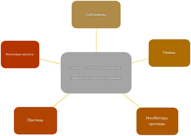 Однако существуют и «антипитательные» растительные вещества, которые снижают биодоступность минералов, усвояемость органических веществ, а также могут приводить к токсичности. Часто их характеризуют не по их эффекту, а скорее по типу молекул. Это создает ситуацию, при которой антипитательные вещества могут быть отнесены в категорию, которая также включает молекулы, которые не только являются антипитательными веществами, но и обладают другими эффектами.