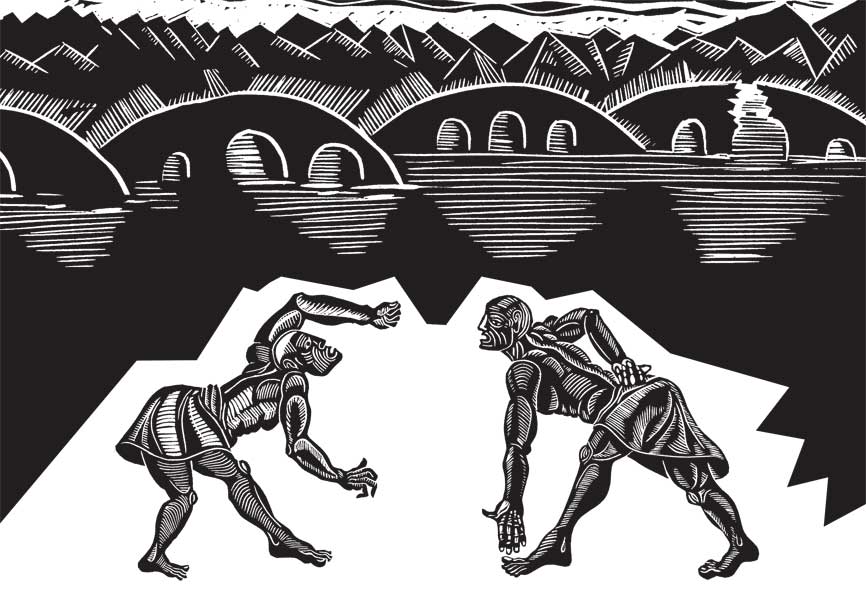 Как волны в бурлящей пучине Харибды набегают, сталкиваются и разбиваются друг о друга, так здесь, в четвёртом круге, выплясывают грешники свою пляску.