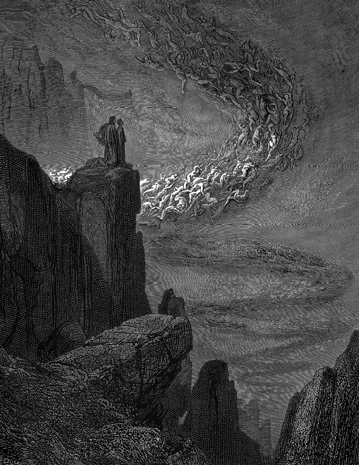 13 На сколько ступеней пониже в АдИм осужденный призрак повергался,И тем хвостом, свернувшимся в обхват, 16 Род казни их всегда определялся.Пред Миносом, покаявшись в грехах,Ряд призраков один другим сменялся 19 И падал в бездну с воплем и в слезах.Меня увидя, Минос суд ужасныйОстановил с проклятьем на губах: 22 «Зачем ты здесь, скажи, пришлец несчастный?Здесь мир скорбей и ужаса приют.Сюда тебе ворота отопрут, 25 Но выйти вон отсюда очень трудно».«К чему грозишь? – сказал мой проводник. –Мы не поймем друг друга обоюдно: 28 Тот, кто своим могуществом велик,Сойти сюда ему дал позволенье.Впусти ж его и удержи язык». 31 И вопли я услышал в отдаленье,Когда вступил в тот мрачный, адский круг,Где раздавались стоны исступленья, 34 Где омертвел, казалось, свет вокруг,Где, словно вечный ропот океана,Носился гул неутихавших мук; 37 Где адские порывы урагана,Бичуя и терзая и кружа,За тенью тень несли среди тумана, 40 И души падших грешников, дрожа,Стеня, хулы на Бога изрыгали.За чувственность казнь эту заслужа, 43 Как я узнал, те души в Ад попали…Как стаи птиц в холодный день зимыВ бессилии мятутся, так летали, 46 Вперед и взад метались в Царстве тьмыСтрадальческие тени. В их страданьеНадежды нет; должны смутиться мы – 49 Лишенные в грядущем упованья,Им отдыха в мучениях не знать.Как в небе журавли в ночном молчанье 52 Начнут, порою, жалобно кричать,Так тени, в общем плаче надрываясь,Неслись в Аду, не в силах устоять 55 В круженье вихря знойного. Теряясь,Про сонм тех душ поэта я спросил,Их адскому круженью ужасаясь. 58 «Вот первая, – Вергилий говорил, –Народов многих гордая царица.Пороком лишь – он ей законом был – 61 Жила сластолюбивая блудница,Открыто поощрявшая разврат.Звалась Семирамидой та срамница. 64 Она была, как хроники гласят,Женою и преемницею Нина,Владея краем, – край тот был богат, 67 Где властвует Судан теперь. КручинаДругую тень смущает: то жена-Самоубийца 1.Горькая судьбина 70 Ее любви печальна и страшна.Вот призрак Клеопатры сладострастной…»Затем Елену видел я: она 73 Являлась на земле звездой несчастной;За нею шли – великий муж Ахилл,Погибший от любви своей напрасной, 76 Парис, Тристан 2… Вергилий повторилИмен людей прославленных немало,Которых пыл их страсти погубил. 79 От состраданья к ним изнемогалаМоя душа, и был я поражен,Когда близ нас собрание предстало 82 Известнейших мужей и славных жен.И я сказал: «Мне хочется, Вергилий,Речь повести с четой теней, как сон, 85 Скользящей и несущейся без крылий».«Пусть ближе налетят они, тогда, –Сказал поэт, – мы можем без усилий 88 Для той беседы вызвать их сюда,Любовью, их связавшей, заклиная».Вот дунул ветр. Как облаков гряда 91 Несется, воли собственной не зная,Приблизились к нам тени. Оживясь,Воскликнул я, к себе их призывая: 94 «О, страждущие тени! Если насБеседой подарить вы в состоянье,Поговорите с нами!» Как подчас, 97 При радостном, веселом воркованьеК родимым гнездам голуби летят,Так при моем невольном восклицанье 100 Чета теней, сквозь общий вихрь и смрад,Толпу тех душ покинув, где стоялаНесчастная Дидона, – тихо, в ряд, 103 Порхнула к нам. Одна из них сказала:«Ты, ради нас сошедший в эту тьму,Ты, чья душа к нам жалость испытала, 106 Хотя преступны все мы, – твоемуВеличию не можем не дивиться,И если бы, в грехах своих, Ему, 109 Творцу миров, мы смели помолиться,Просили б мы, чтоб мир и благодатьНа голову твою могли спуститься 