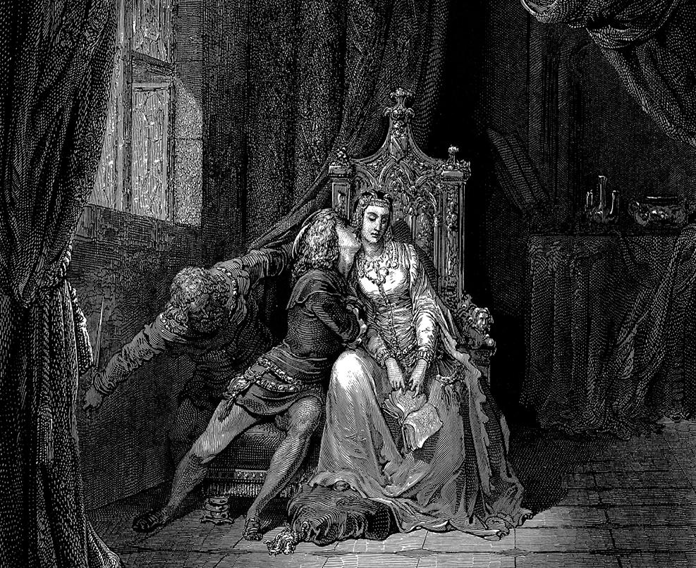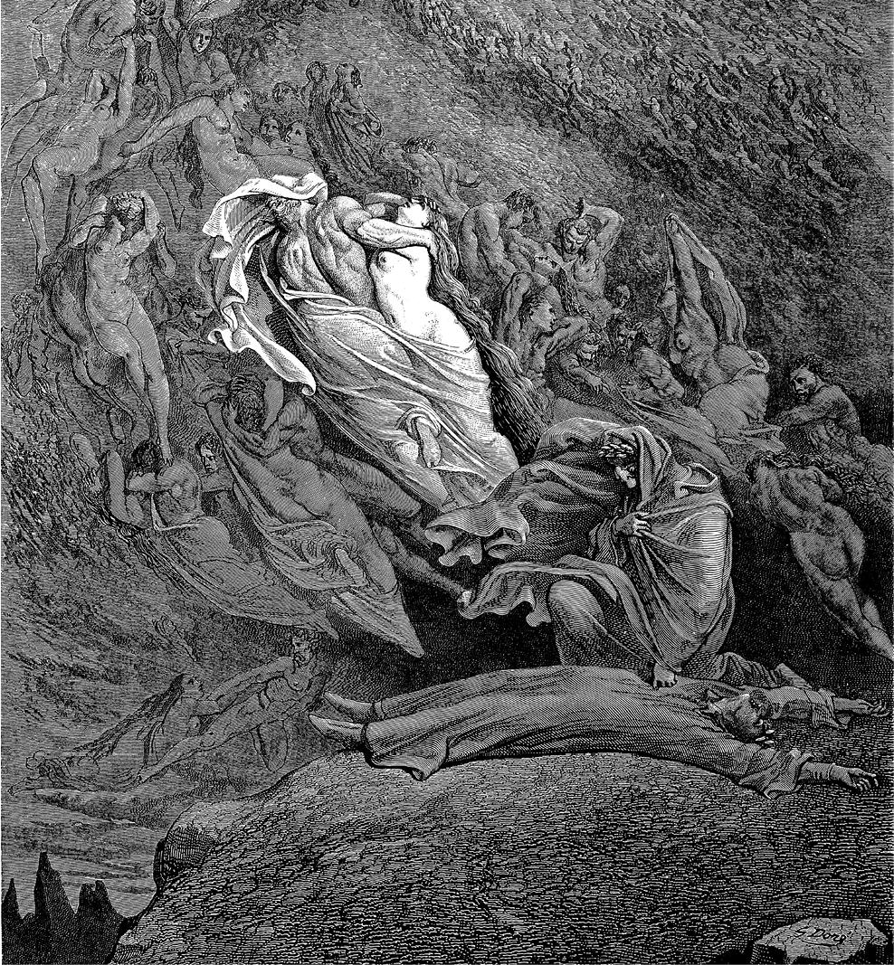 145 И чувство непонятное узнала?»Франческа мне дала такой ответ:«Воспоминания язвят меня, как жало!.. 148 Ужасней и сильнее скорби нет –О днях блаженства вспомнить в дни печали;О том тебе расскажет твой поэт, 151 С тобой идущий. Если о началеМоей любви ты хочешь правду знать,Так слушай же, как мы любовь узнали: 154 Рассказ мой слезы будут дополнять…Однажды Ланчелота 4 приключеньяМы с любопытством начали читать, 157 Где он любви испытывал волненья.Чувств собственных не ведая тогда,Одни мы оставались в те мгновенья. 160 От книги отрываясь иногда,Бледнели мы, и чтенье забывалось;Мы трепетали вместе, но когда 163 Одна страница в книге нам попалась,Решилась вдруг судьба обоих нас:Читали мы, как сладко улыбалась 166 Влюбленная красавица в тот час,Когда любовник пламенный и страстныйПоцеловал в уста ее. Зардясь,