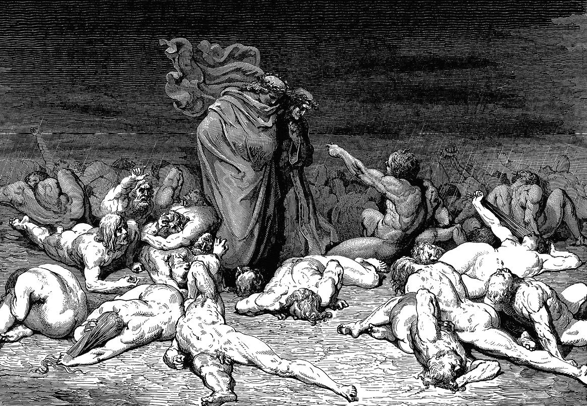 Пятый круг Ада. Флегиас перевозит чрез болото Стикса Вергилия и Данте. Отвратительные мучения Филиппа Ардженти. Путники приближаются к адскому укреплению Дитэ, где адская стража демонов преграждает им вход в проклятый город.