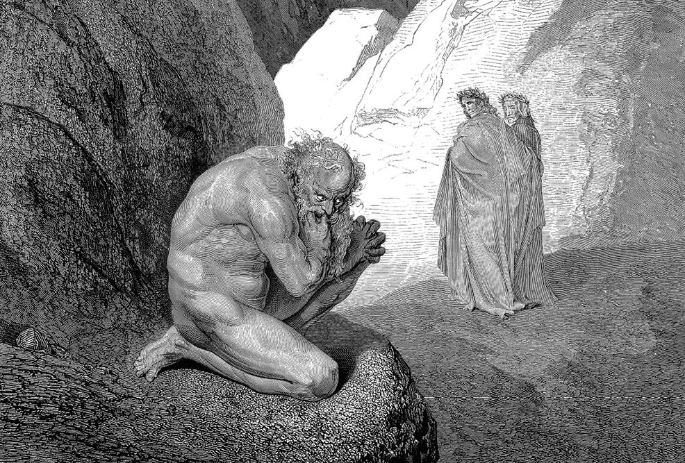 25 Бежать назад, так в вечном исступленьеДолжны сшибаться тени меж собой.Их много здесь, кричащих в озлобленье. 28 Двойной толпой они вступают в бойИ, тяжести огромные бросаяДруг в друга, поднимают дикий вой, 31 С упреками такими отступая:«Что бросил ты?» «А ты что не бросал?»И, двигаясь и вновь в борьбу вступая, 34 Ревут, бегут, как моря грозный шквал,И снова отступают и мятутся,И снова бой… Скорбеть о них я стал, 37 Успела жалость в сердце шевельнуться.«О, кто они? Поведай мне, поэт!Вон там, левей, – иль мог я обмануться?.. 40 Толпа духовных лиц… Сомненья нет:На них я вижу знаки постриженья».«Знай, все они, – мудрец мне дал ответ, – 43 Свой разум довели до ослепленья,И грех их – расточительность. ВзгляниНа их толпу, на шумное движенье: 46 Здесь гранью полукруга все ониОтделены от области другогоГреха. Ты угадал – в иные дни