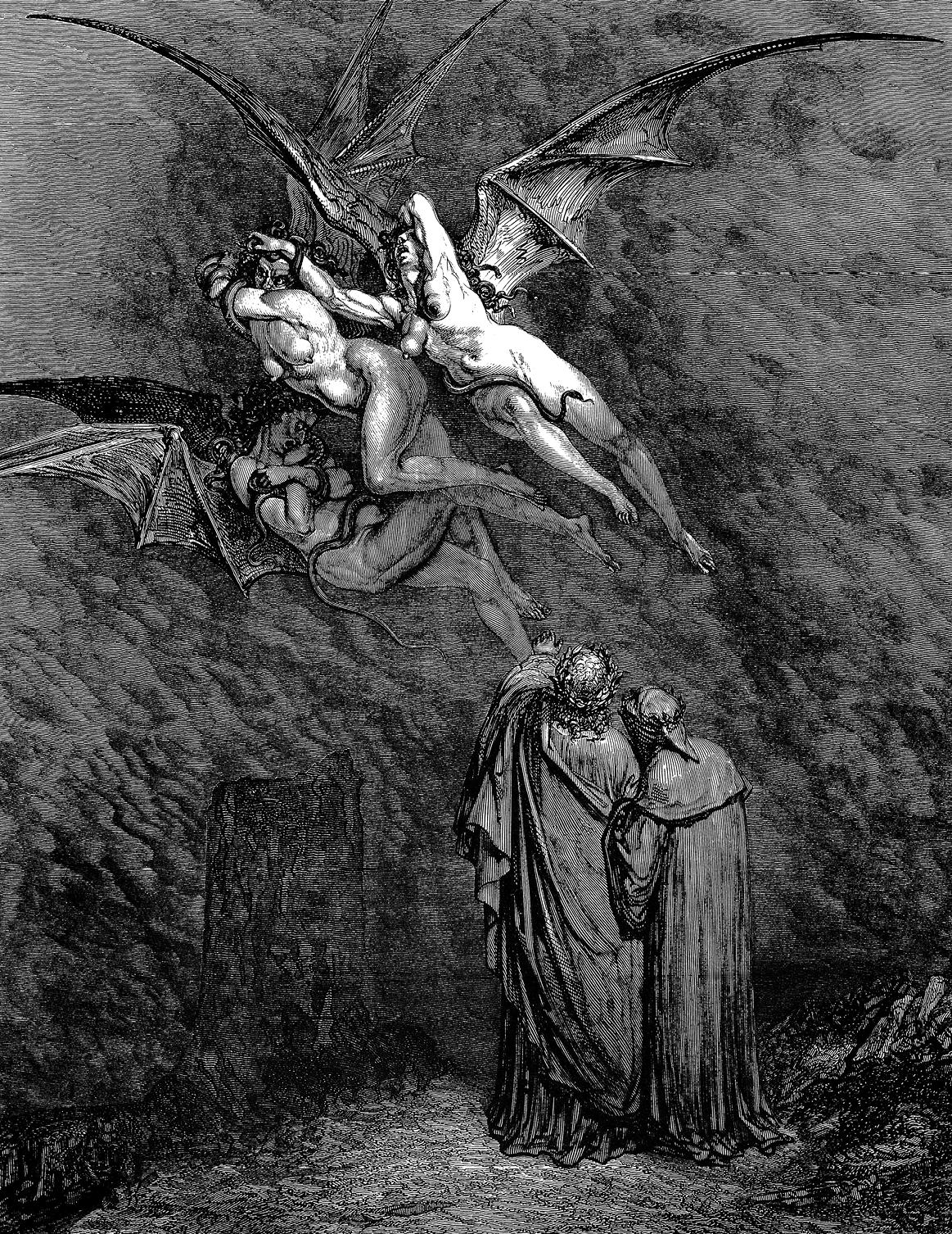 1 Мы шли вдоль по обрыву мимо скал,Поверженных, как каменные трупы,И подошли к вертепу: изрыгал 4 Он из себя зловония, – и группыПроклятых душ стонали в нем. Мы шли,Хватаясь за гранитные уступы, 7 И так как выносить мы не моглиЗловонных испарений, то спасеньеЗа каменной гробницею нашли. 10 Где надпись увидали в то мгновенье:«Здесь папа Анастасий заключен,Что был введен Фотином в искушенье»1. 13 «Кругом весь воздух смрадом заражен,И медленней мы будем подвигаться,Чтоб к смраду понемногу приучен 16 Был ты и я: не станет он казатьсяНам столько отвратительным потом», –Так молвил мне учитель. «Может статься, – 19 Я возразил, – пока вперед идем,Ты что-нибудь расскажешь мне дорогой?»«Да, и теперь я думаю о том», – 22 Я услыхал поэта голос строгий.Он продолжал: «Смотри, мой сын, вокруг(И слушал я его с большой тревогой): 25 В три яруса идет за кругом кругСредь этих скал, один другого шире.И каждый круг – обитель вечных мук 28 Для падших душ в подземном этом мире,Но чтоб тебе, взглянув на них, понять,Что в Небе, в голубом его эфире 31 Пощады им вовек не прочитать, –Я расскажу, за что их заключили:Ужасней зла не можем мы назвать, 34 Как ближнего обида. ДоходилиДо этой цели ложью иногда.Иль вред через насилье наносили 37 И ближних обирали без стыда.За этот грех нет в Небесах прощенья.Обман – порок людей и был всегда 40 Караем Богом он без сожаленья,И каждый злой обманщик, каждый татьПовержен в самый страшный Ад мученья, 43 Куда не сходит Божья благодать.Знай: в первый круг попали души мрака,Виновные в насилье, но опять, 46 Так как насилье может быть трояко,То на три части делится тот круг,С тройным различьем в грешниках, однако. 49 Насилие людских сердец и рукБывает против ближних, против БогаИ против жизни собственной. Вокруг 52 Увидишь ты таких пороков много:Убийство, грабежей ночных позор.Вот первый круг, где наказуют строго 55 Насилье против ближних: гнусный вор,Убийца злой, не пощадивший друга,В вертепе том томятся с давних пор. 58 А во втором подразделенье кругаСамоубийц и мотов скорбный ряд,Всех посягнувших смело, без испуга, 61 На жизнь свою, – их поглощает Ад –Иль на свое богатство, достоянье,И проливавших слез кровавых яд 64 В те дни, когда любовь и ликованьеДолжны бы были в сердце обитать…А те преступно жалкие созданья, 67 Что стали имя Бога отвергать,Богохуля, природу оскорбляют,Те в меньшем круге стали обитать. 70 На проклятом челе их замечаютКлеймо неизгладимое почтиСодома и Кагора 2. Но бывают 73 Грехи другого рода, и найтиИх можем мы в другом подземном круге.Запомни те грехи и перечти: 76 Грех сводничества, льстивости услуги,Татьба, и святотатство, и подлог,Ложь всякая, когда уж друг о друге 79 Забыли люди думать, и порокДля них стал всякой доблести заменой.Есть грех еще – он страшен и жесток – 82 Он – смерть любви: зовут его изменой.В одной из самых низших адских сфер,Где стало средоточие Вселенной, 85 Где восседает грозный Люцифер,Обречена измена вечной казни,Чтоб казни той был памятен пример». 88 «Учитель, – я сказал не без боязни, –Ты верное понятие мне далО пропасти греха и неприязни, 91 Но ты еще не все мне рассказал.Я видел много грешников сраженных,Которых страшный дождик бичевал, 94 Толпу теней в болото погруженных,Гонимых ветром, с скрежетом зубов,Хулящих Небо, мрачных, исступленных, 97 И я о них спросить тебя готов:Когда над ними кара тяготеет,То почему ж за мерзость 