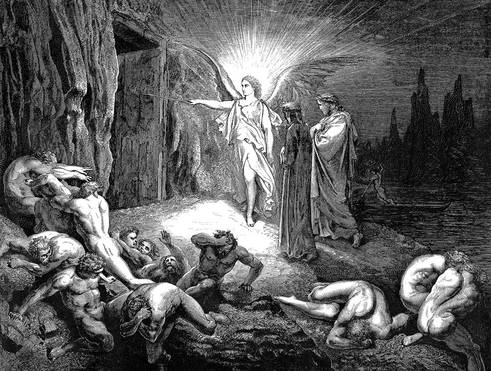 103 Чело его сияло; он стремилсяКо входу в град. Коснулся он воротСвоим жезлом, и тихо отворился 106 Пред нами недоступный прежде вход;И на пороге ставши в это время,Воскликнул он: «Погибший, жалкий род! 109 Проклятое, низвергнутое племя!Вы Небесам противитесь опять!Иль высшей власти тягостное бремя 112 Крамолами вы думаете смять?К чему вели все ваши возмущенья?Они могли лишь только умножать, 115 Усиливать в Аду для вас мученья.Припомните: ваш Цербер – адский зверьСлед роковой неравного боренья 118 На шее носит даже и теперь!..»И, не сказавши более ни слова,Покинул он открытую им дверь 121 И по волнам назад пустился снова.Казалось, озабочен сильно былОн думами значения иного 124 И о судьбе двух странников забыл.А мы, им успокоены, вступилиВ обитель ту, куда он путь открыл, 127 Где духи тьмы уже нам не грозили.Желая знать про участь тех теней,Которых в эту крепость заключили, 130 Окрестность осмотрел я, и на нейПечальные поля глазам открылись,Поля жестокой муки и скорбей.
