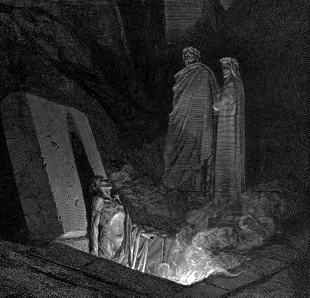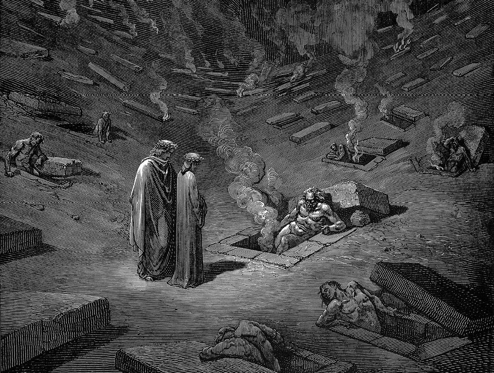 Перед Данте и Вергилием встает ряд могил, в которых находятся последователи Эпикура. Путники говорят с призраками Фарината дельи Уберти и Кавальканте де Кавальканти. Первый предсказывает Данте изгнание из Флоренции.