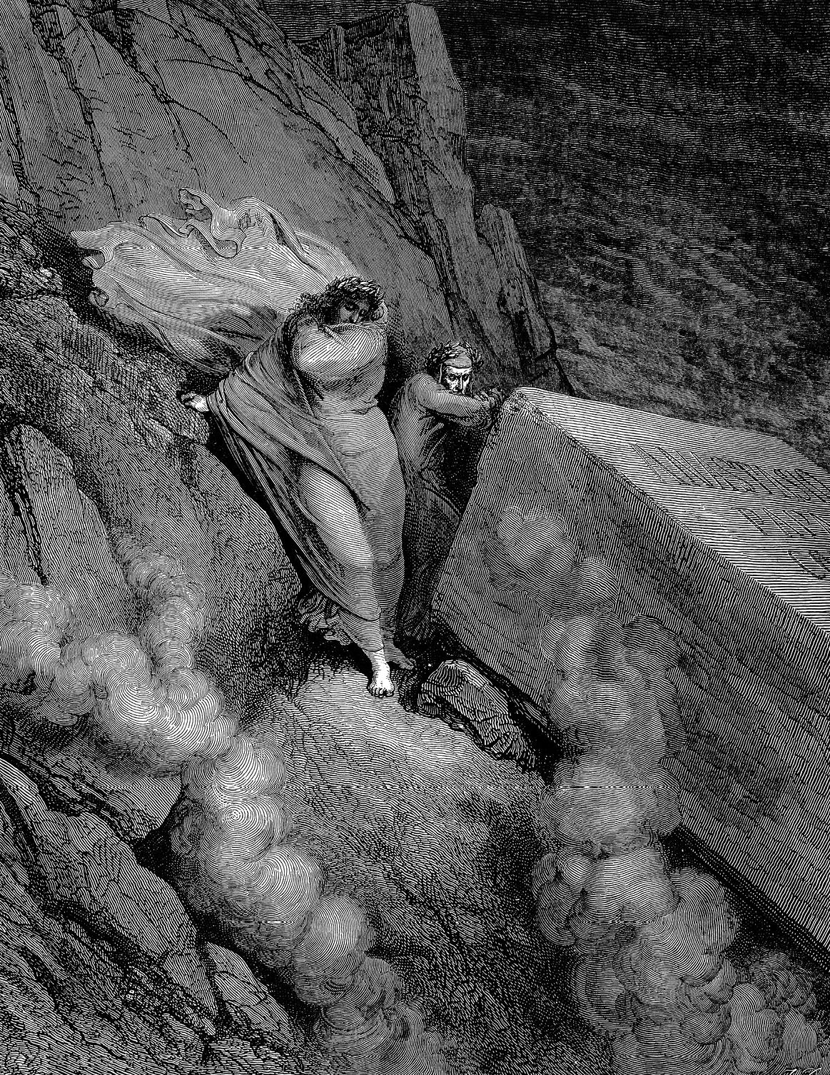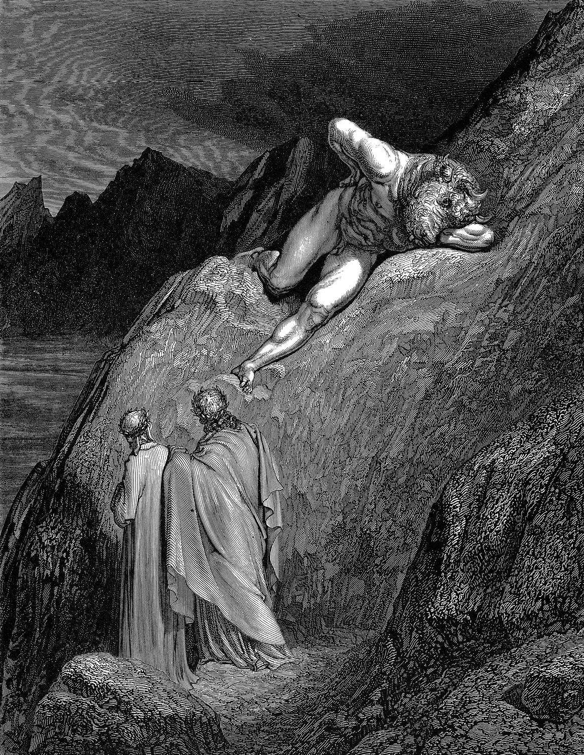 1 Дорога, по которой в этот часНам приходилось далее спускаться,Была почти отвесна, и не раз, 4 Взглянувши вниз, мог всякий содрогаться.Гора, с которой сброшен был обвал,Непроходимой стала мне казаться 7 С вершины до подножья: груды скалНизринуты лежали перед нами.Таков был спуск, и бездны мрак зиял 10 Над ним кругом, а близко, под ногами,Чудовище лежало на скале 1,Чудовище, которое сосцами 13 Не матери питалось на земле,Но деревянной телки… Ужас Крита,Чудовище, заметя нас во мгле, 16 Себя кусало, пеною покрыто,Не в состоянье бешенства смирить.И закричал мой проводник сердито: 19 «Тварь гнусная! Ты мыслишь, может быть,Что царь Афин к тебе явился снова,Чтоб вновь тебя, чудовище, убить? 22 Прочь, гадина! Для подвига иногоСпустился этот смертный в Ад сюда;И у него желанья нет другого, 25 Как только посмотреть на Царство мук…»Как ярый бык в минуту пораженьяСрывает узы тягостные вдруг 28 И, силы потерявший, в исступленье,Бросается то прямо, то назад,Так Минотавр метался в то мгновенье. 31 Поэт сказал с любовью мне, как брат:«Скорее вниз, пока он бесноватьсяНе перестал…» И, не боясь преград, 34 Чрез груды скал мы начали спускаться,А из-под ног срываясь, камней рядЛетел и падал в бездну. Подвигаться 37 Я стал вперед, кругом бросая взгляд,И размышлял, поэта слыша голос:«Ты думаешь, быть может, мой собрат, 40 О той скале, что сверху раскололась,И где теперь чудовище лежит,В котором злость с бессилием боролась? 43 Мной усмирен, ужасный зверь молчит.Так знай же, что, когда еще впервыеСходил я в Ад, вон той скалы гранит 46 Еще был цел, и камни вековыеНе треснули. Случилось то позднейВ другие дни и времена иные,
