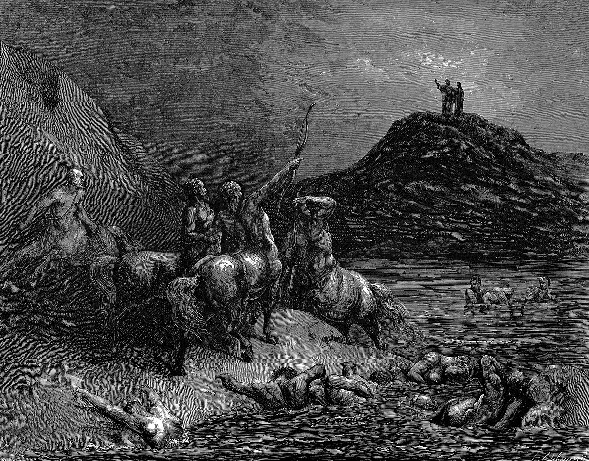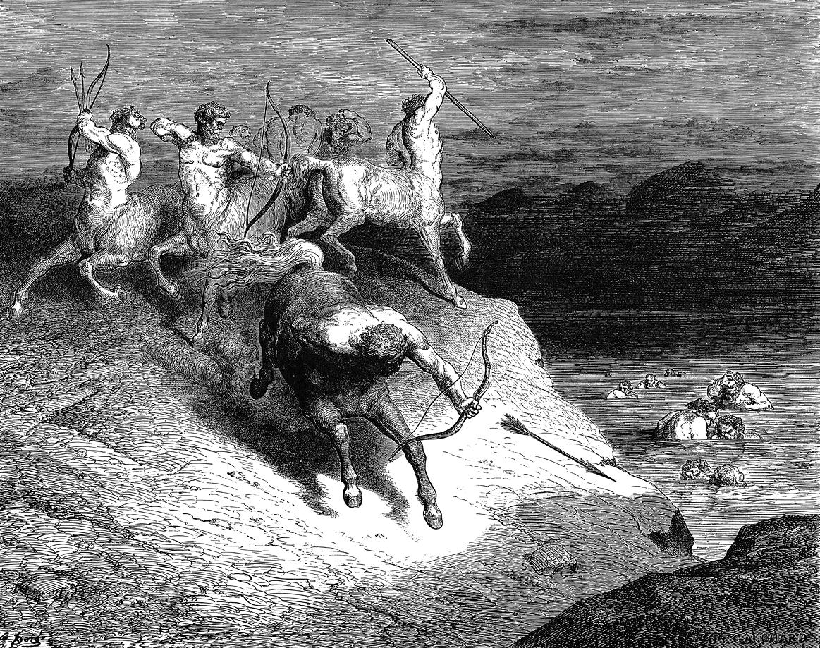 Данте и Вергилий спускаются в седьмой круг подземного Ада по отвесному обрыву, где на полуразрушенной скале находят чудовище – Минотавра. Вергилий смиряет его бешенство. Встреча с центаврами, из которых один – Несс делается проводником двух путников и указывает на кровавый поток, где грешники по степеням терпят кару за насилие.