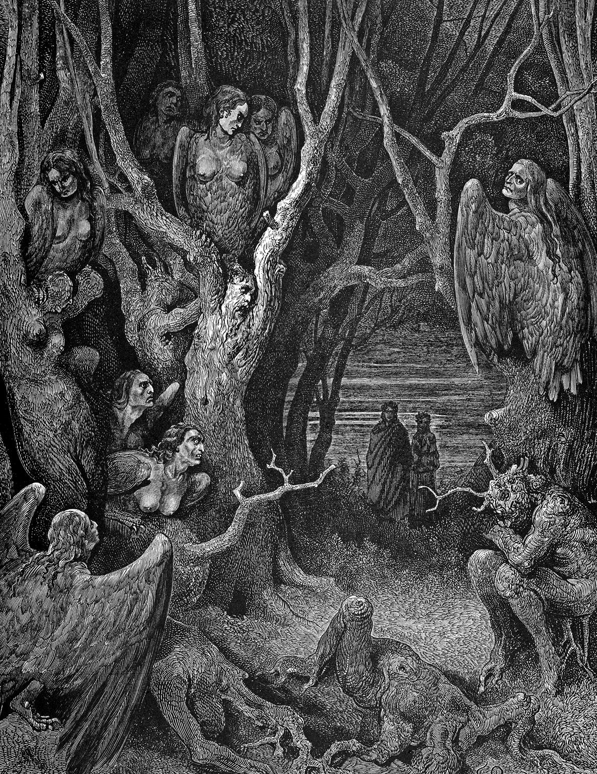 Путники вступают во второй отдел седьмого круга. Перед ними самоубийцы, превращенные в деревья, и расточители, терзаемые гарпиями. Пьер делле Винье, секретарь Фредерика II.