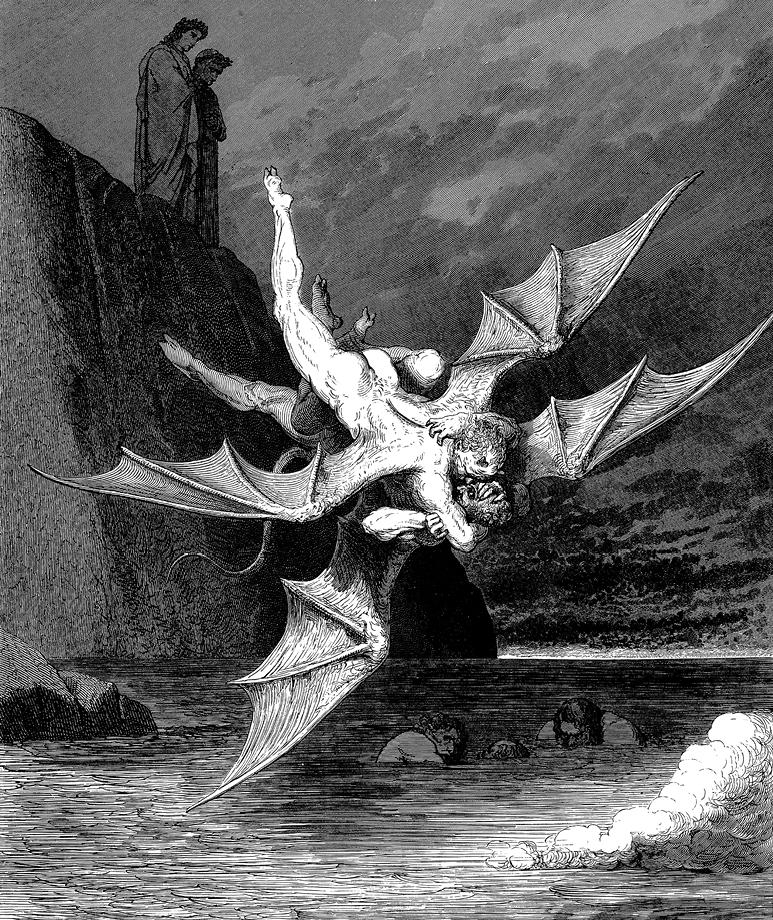 157 Наваррец, улучив одно мгновенье,Ногами быстро в землю оперся.Прыгнул и скрылся в бездне, заключенья 160 Избегнув: ловкий подвиг удался.Но демонов взбесил обман подобный;Особенно взбесился демон злобный, 163 Который сам к обману повод дал,С неистовой он злобой зарычал:«Ты будешь мой!» Но было уже поздно… 166 Напрасно в пропасть ринулся он грозно,Подобно с лука спущенной стреле.Но грешник уж исчез давно в смоле 169 И выглянуть оттуда не решался,А черный бес отпрянул и опять,Взмахнув крылами, на берег поднялся. 172 Так под водой приходится нырятьНесчастной утке, если над водоюОна увидит сокола порою. 175 Ему же вновь приходится взлетатьПод облака и промаха стыдиться.Взбешенный Калькабрина рад сорвать 178 Был гнев на ком-нибудь, был рад сразитьсяИ демона над пропастью схватил,Откуда тот удумал возвратиться,