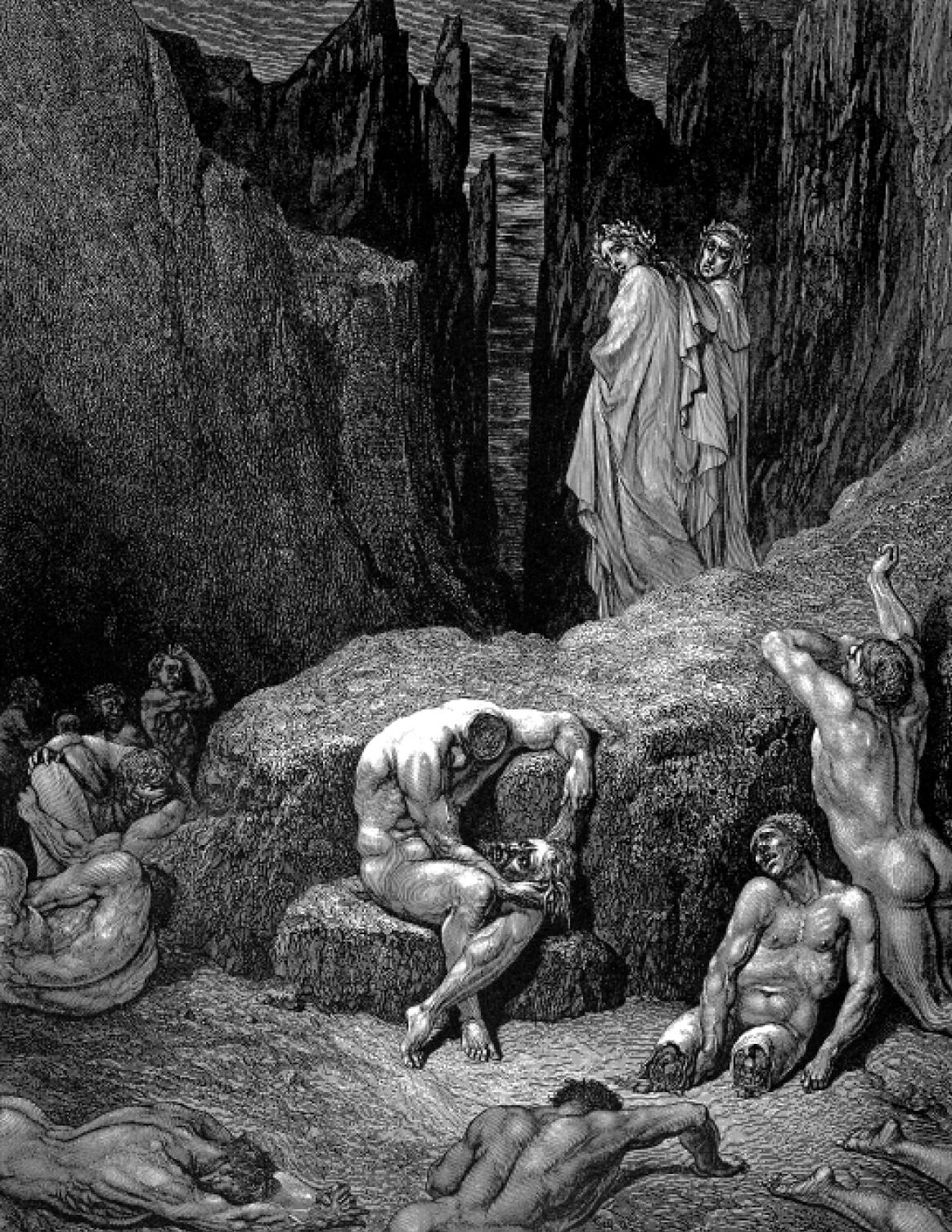 Появление в светильнике призрака Гвидо де Монтефельтро. Рассказ Вергилия о состоянии Романьи. По удалении призрака путники переходят из восьмого в девятый вертеп.
