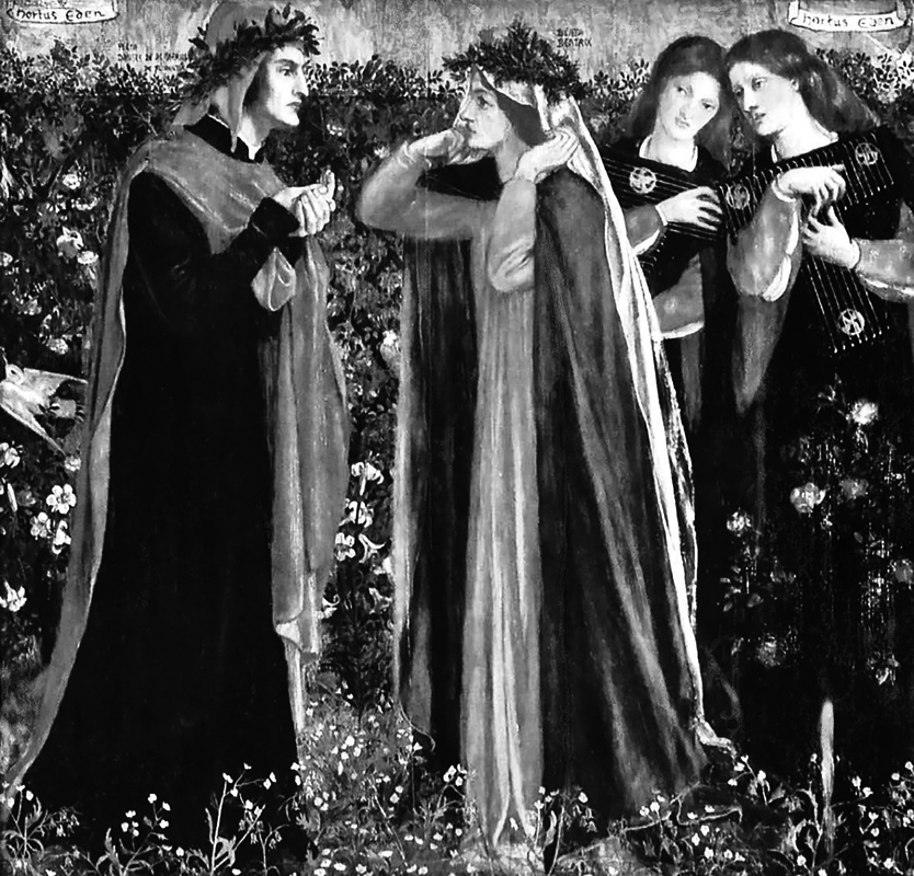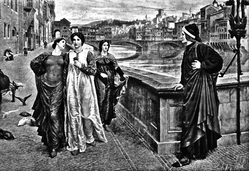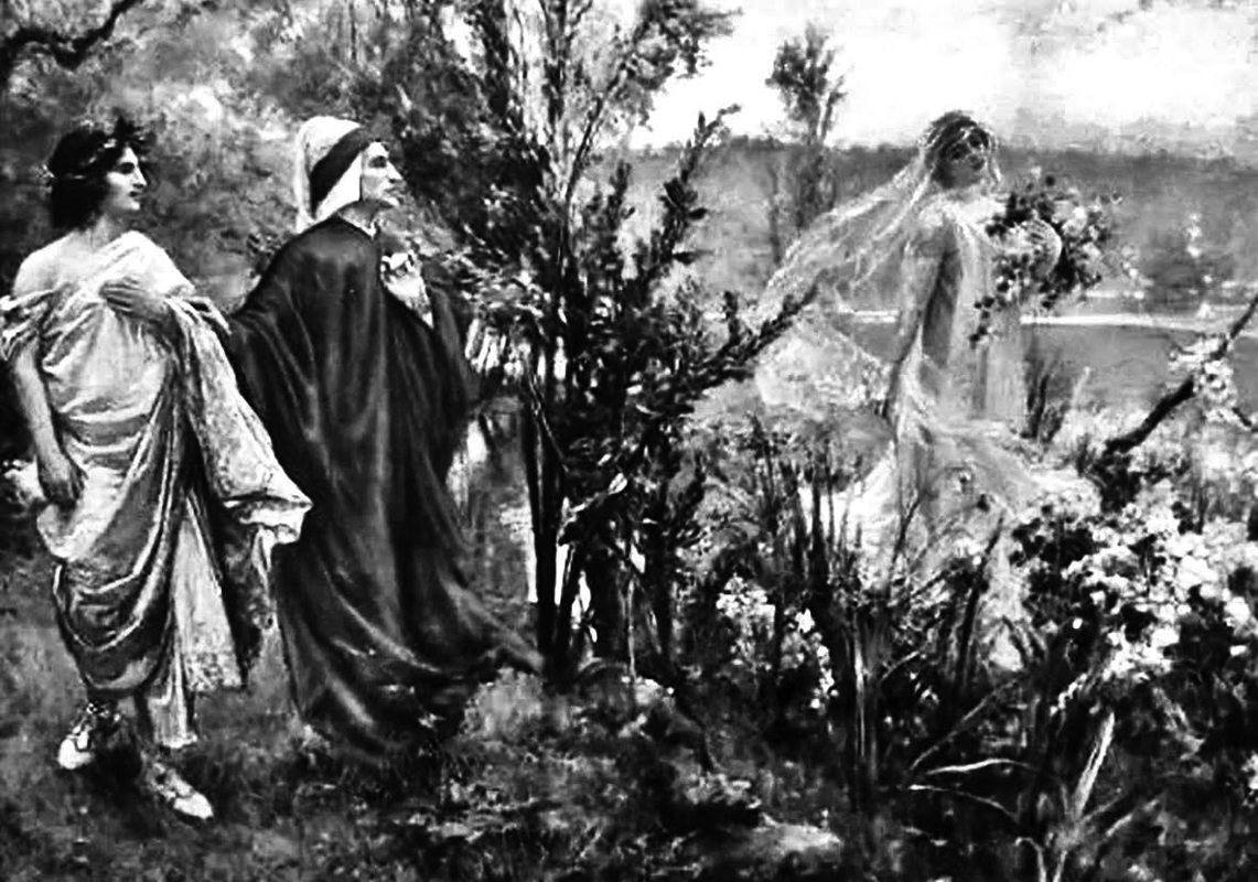 Он читал все, что попадало под руку, и перед ним понемногу начинал рисоваться его собственный путь ученого, мыслителя и поэта. Данте сознательно выбрал среди поэтов Вергилия, который вскоре стал его «вождем, господином и учителем». Он овладел французским и провансальским языками и стал поглощать в огромном количестве поэмы о Трое и о Фивах, об Александре Македонском и о Цезаре, о Карле Великом и его паладинах, а в рифмованных французских энциклопедиях и дидактических поэмах находил знания, которых не мог приобрести в школе. Первые образцы стихов дали ему провансальские поэты. Прямым же вдохновителем Данте был его верный друг Гвидо Кавальканти, самый яркий представитель нового поэтического направления dolce stil nuovo. Как все поэты этого стиля Данте соединяет восхваление избранной им героини (Беатриче – дочери друга его отца Фолько Портинари) со спиритуалистическим и мистическим толкованием любви как стремления к божеству. Сложная символика образа возлюбленной Данте вызвала огромную литературу по этому вопросу, причем часть исследователей склонна была видеть в Беатриче лишь поэтическую фикцию – аллегорическое выражение политических или философских идеалов и чаяний автора. Реальное существование Беатриче можно считать установленным с тех пор, как было найдено в архивах завещание Фолько, в котором упоминается имя его дочери Беатриче, в то время уже супруги Симоне деи Барди.