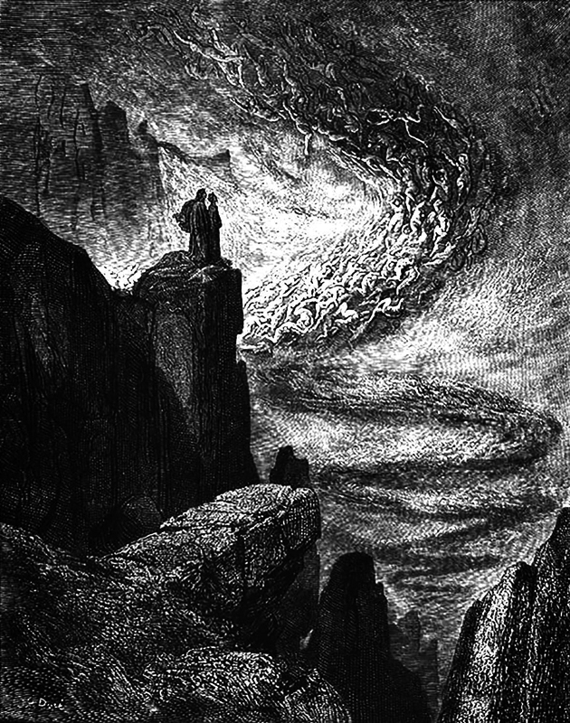 Об руку с Вергилием поэт вступил во тьму глубокой бездны, над вратами которой начертаны слова: «Оставь надежду всяк сюда входящий». Обоих поэтов встречают несметные толпы людей, проживших жизнь «без хулы и без хвалы», отринутых даже адом. Они должны вечно вертеться у его преддверия, даже не удостоившись мук. «Взгляни и пройди», – guarda e passa – презрительно бросает Вергилий, увлекая Данте дальше. В ладье Харона переправляются поэты через первую адскую реку Ахерон и попадают в лимб, где без муки, в полублаженстве живут души языческих праведников и где Данте принят шестым в содружество великих поэтов древности – Гомера, Вергилия, Горация, Овидия и Лукана. Это – первый круг ада. В преддверии второго – древний Минос судит грешников, а в самом круге в густом мраке воет неистовый ураган и в вихре носятся ду́ши осужденных за грех сладострастия. Это – V песнь «Ада» с бессмертным эпизодом Франчески и Паоло. В третьем круге, где не переставая лает трехголовый Цербер, мучаются под непрестанным снегом и градом обжоры, и Данте слышит первое касающееся его судеб зловещее пророчество: Флорентиец Чакко предсказывает поэту распрю «белых» и «черных» и ее исход. В четвертом круге, как древний Сизиф, влекут тяжести скупцы и расточители; среди них много пап и кардиналов. Тут же (VII песнь) чудесный образ Фортуны. Дальше путь преграждается адской рекой Стиксом, через которую поэтов в своей ладье перевозит мифический вольнодумец Флегий, по преданию, сжегший храм Аполлона. Пока они плывут, на лодку пытается напасть неукротимый Филиппо Ардженти, флорентиец из знатного рода Адимари. Поэты вошли в пятый круг, где мучаются гневные. За Стиксом возвышаются раскаленные башни адского города Диса, где казнятся еретики. Ворота охраняются демонами, которые не хотели пропускать поэтов, пока не явился посланный небом ангел и не отворил ворота своим жезлом. Это шестой круг – X песнь, центром которой являются поразительный по мощи и пластичности эпизод с Фаринатою дельи Уберти, в который втиснут другой – с Кавальканте деи Кавальканти. Седьмой круг, где мучаются насильники, распадается на три отделения: схоластическая систематика и моральный замысел поэта начинают требовать все большей детальности. В первом из этих отделений течет третья река преисподней Флегетон, несущая вместо воды потоки кипящей крови; в ней барахтаются насильники против людей и тираны; когда они хотят выбраться на берег, их поражают стрелами скачущие по берегу кентавры. Здесь Александр Македонский, Пирр Эпирский, Аттила, Эццелино да Романо и другие. Второе отделение наполнено согрешившими насилием против себя – это самоубийцы; они превращены в деревья, терзаемые гарпиями. Данте сломал сук одного дерева, и оказалось, что он ранил Пьеро делла Винья, поэта Фридрихова сицилийского кружка. Третье отделение – обиталище насильников против бога и природы; их тоже три вида: богохульники, ростовщики и содомиты; они должны, не останавливаясь, бегать под непрерывным огненным дождем.