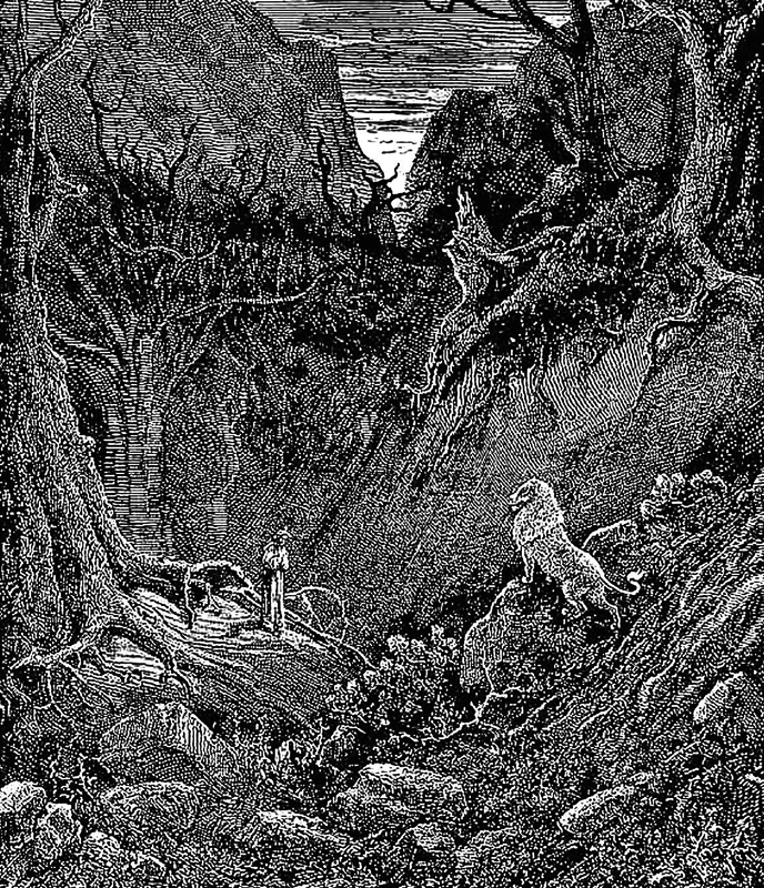 При дальнейшем спуске Данте и Вергилий приходят к водопаду, низвергающемуся в восьмой круг; туда переносит их на себе чудовище Герион, олицетворение обмана.