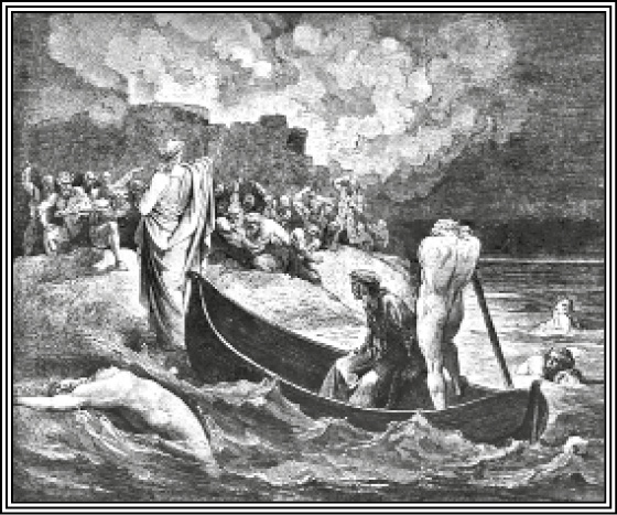 28 И лишь мы сели, древняя ладья Как молния помчалась издалека, Зыбь глубже, чем когда-нибудь, браздя.31 Так плыли мы вдоль мертвого потока; Вдруг весь в грязи дух выплыл из ручья, Вскричав: «Кто ты, идущий прежде срока?»34 А я: «Иду, но не останусь я; Но кто ты сам, весь в тине, безобразный?» И он: «Ты видишь: плачет тень моя!»37 «Так плачь же, дух проклятый, безотвязный! — Воскликнул я, – и множь печаль свою! Теперь узнал я, кто ты, призрак грязный!»