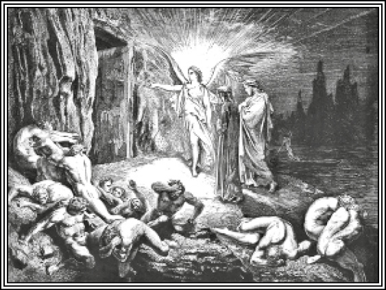 43 И он, узнав служительниц царицы Рыданий вечных, тихо молвил мне: «Вот Фурии, три стража сей темницы.46 Мегера там на левой сторони, Алекто справа плачет в горе диком, А Тизифона между них!» – Они49 Когтями перси[10] раздирали с криком, Стуча в ладони с бешенством таким, Что в ужасе к певцу припал я ликом.52 «Медуза, к нам! их в камень превратим!» — Так, вниз глядя, из всей взывали мочи: «Позор, когда Тезею не отмстим!»55 «О, отвратись! закрой руками очи! Когда узришь Горгону пред собой, Уж не придешь назад из вечной ночи». —58 Так вождь сказал и к ним меня спиной Сам обратил и, к моему спасенью, Закрыл мне очи собственной рукой.61 О вы, чей ум способен к размышленью, Под покрывалом странных сих стихов Сокрытому дивитеся ученью!64 И вот по гребням вспененных валов Пронесся треск со звуком, полным страха, Потрясший высь обоих берегов.67 Так вихрь, рожден борьбой жаров из праха, Неистовый несется прямо в лес И, на него обрушившись, с размаха70 Ломает ветви, валит пни древес И, пастухов гоня с полей со стадом, Уходит горд, пыль взвивший до небес.73 Тогда мой вождь: «Проникни смелым взглядом Над пеной древних волн до рубежа, Где дым с болот встает острейшим чадом».76 Как мечутся лягушки от ужа, Их недруга, и кучей в тине лужи Лежат на дне: так, воя и дрожа79 От ужаса – я видел – мчались души, Смущенные явлением того, Что проходил по Стиксу как по суше.82 Он шуйцей[11] гнал от лика своего Густой туман, мглу черную как смо́лу, И мрак, казалось, утомлял его.85 Я понял вмиг, что он смирит крамолу, И на вождя взглянул: он дал мне знак, Чтоб я молчал, и взор потупил долу.88 О, как разгневан был горящий зрак! Достигнув врат, он жезл поднял железный, И вмиг пред ним разверз их лютый враг.