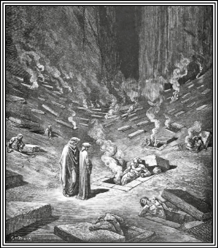 91 «О подлый род, изгна́нный с тверди звездной! — На страшном праге[12] рек он им в ответ, — Кто в вас возжег дух злобы бесполезной?94 Что попирать ту волю, тот завет, Что пред собой все сокрушает грани? Колико[13] крат то было вам во вред?97 Зачем рога уставили для брани? Не ваш ли пес – о вспомни, дерзкий род! — Несет на вые[14] след могучей длани?»100 Он вспять отшел путем нечистых вод, Не обменясь в тот миг ни словом с нами, Как человек, под бременем забот,103 Не зрит того, что пред его очами. — И в крепость мы направили стопы, Подкреплены святыми словесами.106 Тут нам никто не возбранял тропы, И я, вступив в пределы стен высоких, Чтоб видеть казнь томящейся толпы,109 Окинул взором край пучин глубоких И зрел со всех сторон простор полян, Исполненных скорбей и мук жестоких.112 Как близко Арля, где не быстр Родан, Иль как у Полы, где залив Кварнары Грань омывает италийских стран, —115 Могилами изрыты крутояры: Такую здесь увидел я страну, Но вид ее был полон горшей кары.118 Огонь, змеясь между могил по дну, Их раскалял с такой ужасной силой, Как никогда не плавят сталь в горну́.121 Покров висел над каждою могилой И вопль глухой к нам несся из могил, И этот вопль был плач толпы унылой.124 «Учитель мой, кто это, – я спросил, — Казнится здесь под сводами так строго? И почему их голос так уныл?»127 И он: «Здесь казнь еретикам от Бога! Здесь секты всех родов подъемлют стон! Ты не поверишь мне, как здесь их много!130 C подобным здесь подобный заключен И разный жар вмещают их гробницы». И, повернув направо, вышел он133 Меж полем мук и крепких стен бойницы.