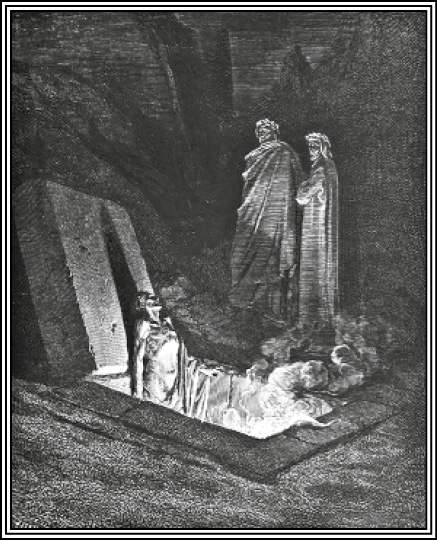 Содержание. Поэты идут между стенами города и могилами. Последние открыты, но в день Страшного суда закроются; в них погребены Эпикур и его последователи, полагавшие, что душа умрет вместе с телом. Из глубины одной из них раздается голос, взывающий к Данту, и вслед за тем поднимается до пояса тень Фаринаты, предводителя Гибеллинов. Он спрашивает Данта о его предках, и узнав, что они были заклятые враги его Гвельфы, говорит с негодованием, что он два раза изгнал их из Флоренции. На это Данте отвечает, что его предки каждый раз возвращались из изгнания, чего не удавалось партии Фаринаты. Пока говорят они, из могилы, недалеко от Фаринатовой, поднимается другая тень: это Гвельф Кавальканте Кавальканти. Он спрашивает, почему Гвидо, сын его и друг Данта, не пришел вместе с ним, и, заключив ошибочно, что сын его умер, опрокидывается в могилу. Между тем Фарината, не обращая внимания на упавшего, продолжает прерванный разговор, предсказывает Данту изгнание и, узнав о причине преследований, направленных флорентинцами против Гибеллинов, с гордостью вспоминает, что он один спас родной город от разрушения; наконец, разрешив Данту некоторое сомнение насчет способности грешников видеть будущее и указав из числа теней, вместе с ним наказуемых, на императора Фридерика II и кардинала Убальдини, исчезает в могиле. Данте с горестью возвращается к Виргилию, который, утешая его, напоминает ему Беатриче, от которой Данте должен узнать истинный путь к божественной жизни. Поэты идут налево к центру города, чтобы спуститься в глубокую долину, со дна которой поднимаются зловонные испарения.