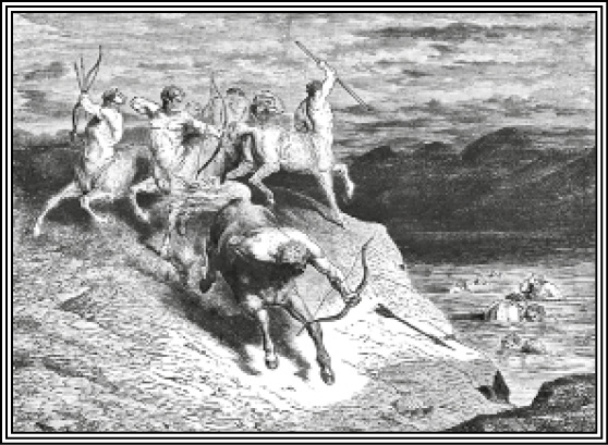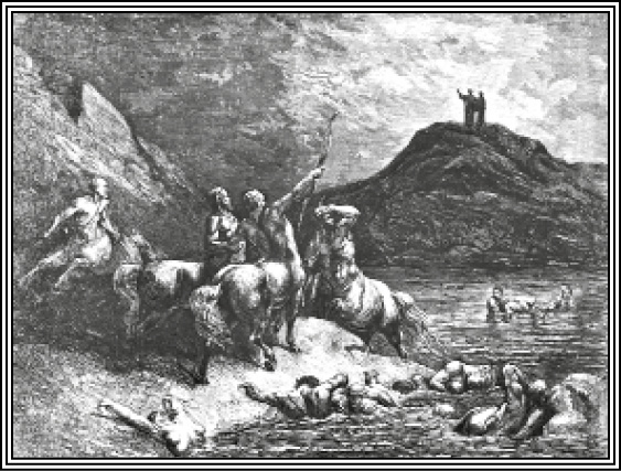 Содержание.Путники приходят к каменной ограде седьмого круга, к первому его отделу (Ада ХІ, 37–39), в котором наказуется насилие против ближних. При виде поэтов, Минотавр, распростертый на границе этого круга, в бешенстве кусает самого себя; но Виргилий укрощает его ярость напоминовением о Тезее, его умертвившем, а пока чудовище крутится от бессильного бешенства, поэты сходят по громадным камням обрыва, обрушившегося в минуту крестной смерти Спасителя. На дне круга дугою изгибается глубокий ров, наполненный кипящею кровью; в нее погружены насилователи ближних. Кентавры, вооруженные стрелами, рыскают по берегам рва и стреляют в тех, которые выйдут из потока крови более, нежели им следует. Трое из них, Несс, Хирон и Фол, бросаются на пришельцев; но Виргилий укрощает и их ярость и, обратившись к Хирону, просит дать им проводника, который бы перенес Данта на хребте своем вброд через поток крови. Хирон избирает Несса, в сопровождении которого поэты идут далее и видят тиранов, погруженных в кровь по самые очи. Из числа их Несс указывает им на Александра, Дионисия, Аццолина и Обидзо Эсте, а в отдалении от них на одинокую тень Гвидо Монфорте. Кровавый поток к одному концу долины все более и более мелеет, так, что наконец едва покрывает ноги грешникам; напротив, к другому концу волны его становятся все глубже и глубже, и здесь-то на дне под волнами плачут вечными слезами: Аттила, Пирр и Секст, и разбойники Реньеры.