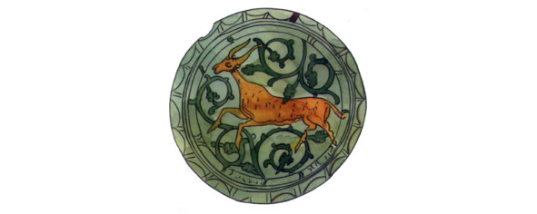 Среди чаш и блюд, украшенных изображениями животных, привлекает внимание полихромная чаша, обнаруженная при раскопках 1939 г. на нижнем дворе Дворца Шиваншахов в слое XII – XIII вв. с изображением бегущего зебу на фоне растительных побегов.93