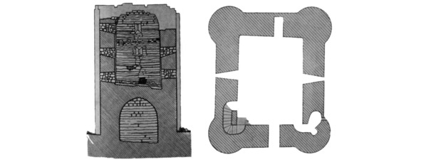 Углы внешних стен укреплены незначительно выступающими из плоскости стены башнями, которые служили главным образом контрфорсами или плавными кривыми. Этот прием весьма характерен для Апшеронских построек. Примерно, посредине западной стены расположена полубашня очень малого диаметра.
