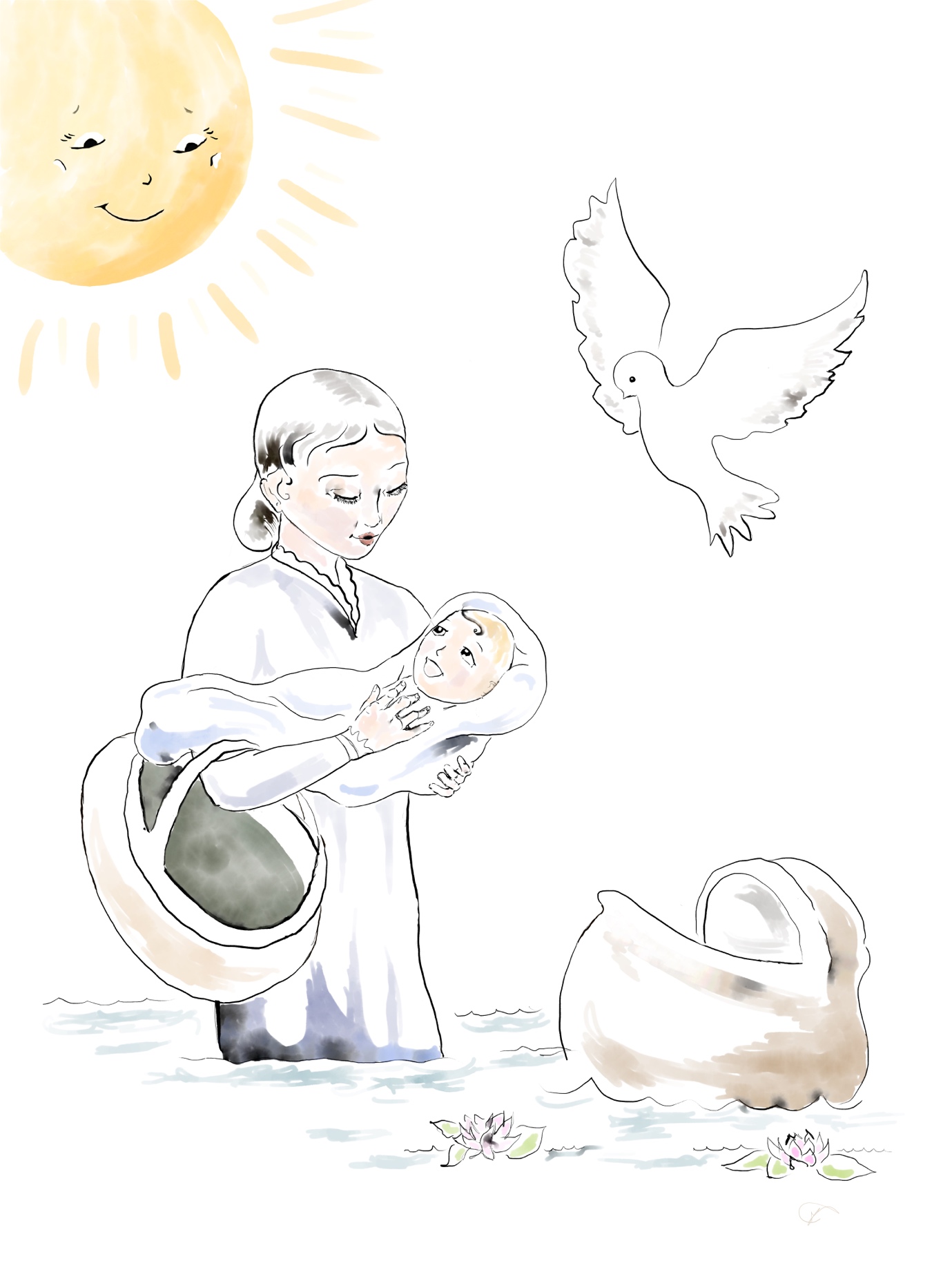 In der angegebenen Richtung sah sie auf dem Fluss in einem Kreis aus zwölf grossen Wasserlilien eine Wiege, in der ein Kind lag, das in den Himmel blickte und voller Freude die Sonne anlachte. Eine weisse Taube erschien über dem Kopfende der Wiege, hielt in der Luft an und flatterte auf der Stelle. Die Stimme der schlanken Birke ertönte aus dem Wald herüber: «Dieses Kind wurde dir gesandt. Nimm es mit nach Hause und in deinem Herzen auf, als wäre es dein eigenes.»