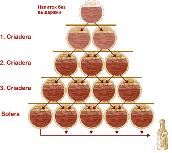 Из бочек выстраивают многоярусную пирамиду, в нижнем ряду от пола – солере (от исп. solera – «на земле») – содержится самая выдержанная жидкость. В стоящей сверху криадере (от исп. criadera – «колыбель») налит более молодой спирт, уровнем выше – еще моложе, и, наконец, в последнем ярусе (а их может быть от 3 до 15) содержится напиток с минимальной выдержкой или вовсе сразу после перегонки.