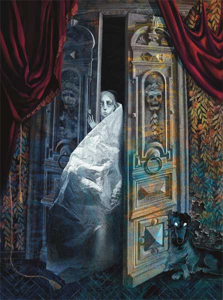 Проходил час за часом, но сон бежал от глаз моих. Я старался стряхнуть с себя это болезненное настроение. Старался убедить себя, что оно всецело или, по крайней мере, в значительной степени зависит от мрачной обстановки: темных ветхих занавесей, которые колебались и шелестели по стенам и вокруг кровати. Но все было тщетно. Неодолимый страх глубже и глубже проникал мне в душу, и, наконец, демон беспричинной тревоги сжал мне сердце. Я с усилием стряхнул его, приподнялся на постели и, вглядываясь в ночную темноту, прислушивался, сам не знаю зачем, побуждаемый каким-то внутренним голосом, к тихим, неясным звукам, доносившимся неведомо откуда в редкие промежутки затишья, когда ослабевала буря, завывавшая вокруг усадьбы. Побежденный невыносимым, хотя и безотчетным, ужасом, я кое-как надел платье (чувствуя, что в эту ночь не придется спать) и попытался отогнать это жалкое малодушие, расхаживая взад и вперед по комнатам.