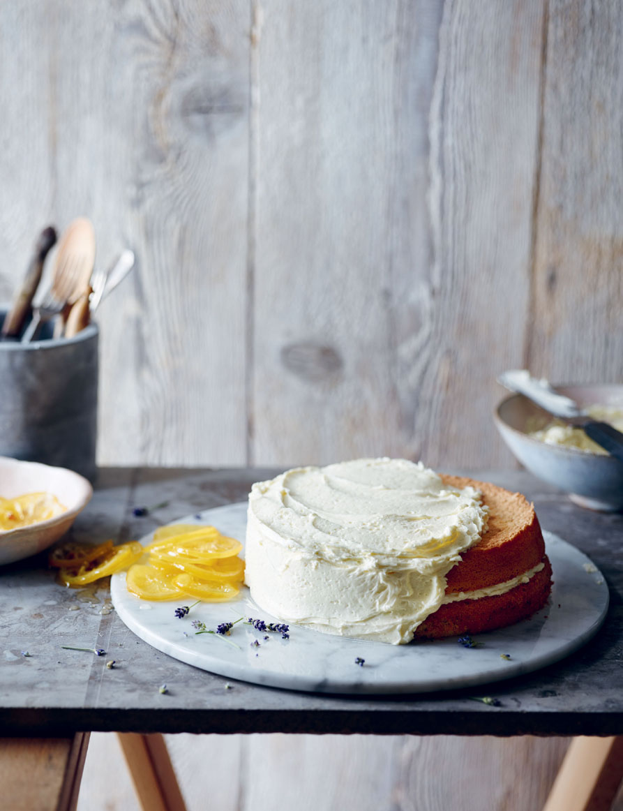 8. Spread about a quarter of the buttercream on top of one cake and put the other cake, base-side up, on top. Spread the remaining buttercream around the sides and on top of the cake. Lay the candied lemon slices on top and sprinkle with a little lavender.