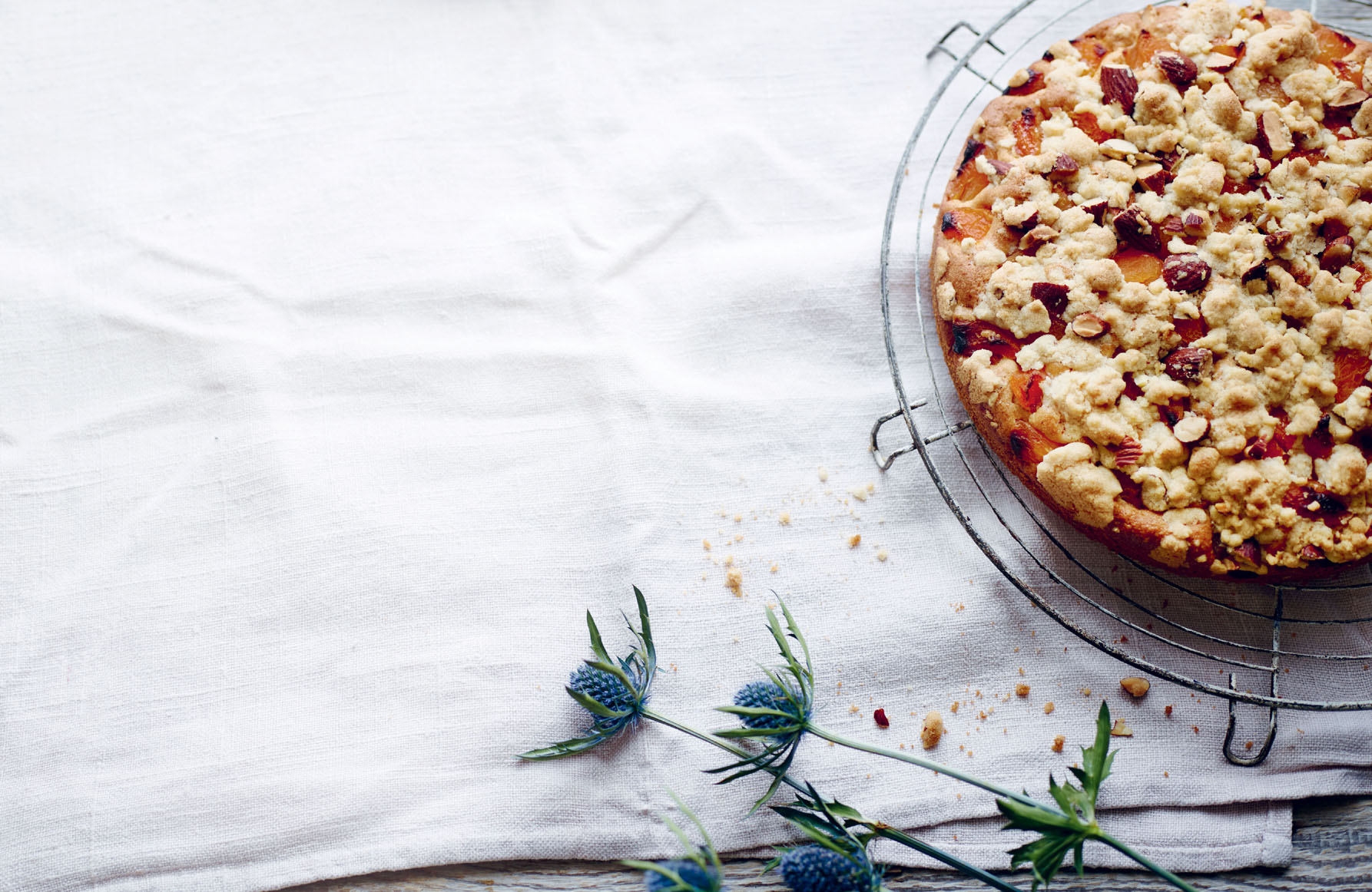 Crunchy crumbles aren’t just for chilly days – this one uses ripe, summer apricots, and you can keep the accompaniments light with fluffy whipped cream – although custard is still allowed if you must! Apricots have a real affinity with almonds, so I’ve added almonds to perk up the crumble mix.