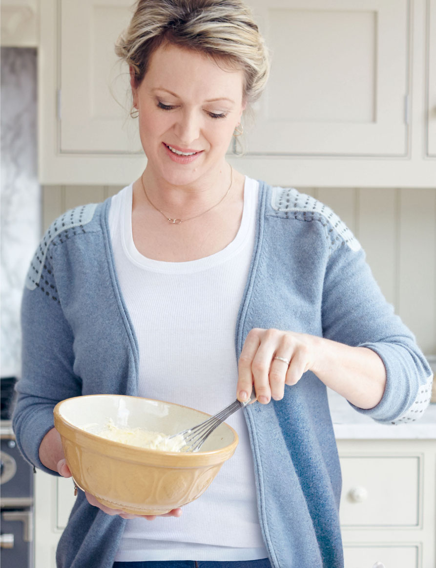 3. To make the sponge base, put the butter in a large bowl and cream it with a wooden spoon until soft, or use an electric beater on slow or a food processor. Add the 125g (4½oz) sugar and beat until light and fluffy. Add the eggs one at a time, beating after each addition. Sift in the flour and baking powder, then fold together.