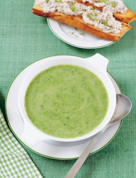 6 When ready to serve, divide the mackerel pâté between the cooled crostini, spread evenly and sprinkle with the remaining dill. Ladle the soup into warm bowls, arrange two pieces of mackerel crostini on the side and serve.