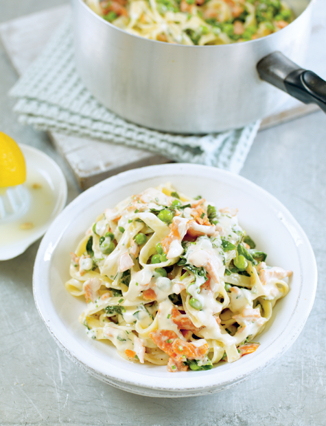 Tagliatelle with smoked salmon, watercress and peas