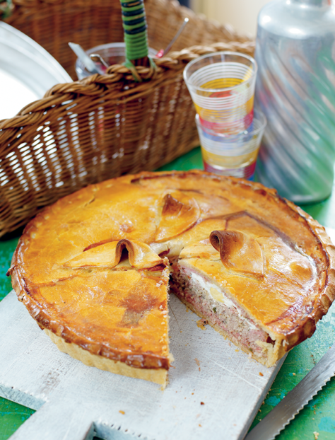 7 Make a hole, about 5mm (¼in) wide in the centre of the pastry at the top of the pie and cook in the oven for approximately 1 hour and 10 minutes—1 hour and 20 minutes or until golden brown and a skewer inserted into the middle comes out hot (too hot to hold on the inside of your wrist). Allow to cool for at least 30 minutes before removing from the tin. When cooled, cut into slices to serve.