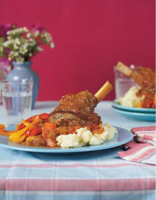 There are times when perfectly cooked lamb seems the cure for just about anything. I love lamb shanks for their tender, succulent texture and sweet, delicious flavour. They’re best cooked at a low temperature for a long time, about 3–4 hours, by which time the meat will be falling off the bone. The piperonata is a wonderful pepper and tomato stew that is very versatile. Serve it as a vegetable accompaniment to a roast as here, or with egg dishes such as omelettes. It can be made in advance and frozen. I often serve this dish with mashed potato (see page 27).