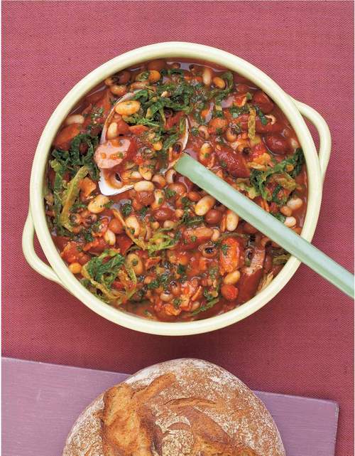 3 Add the cooked, drained beans, then add the cabbage and sliced sausage and cook for a further 4 minutes. Add the chopped herbs, taste and correct the seasoning.