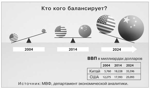 Неоспоримое пребывание Америки на вершине мира позволяет объяснить тот переполох, который случился на совместном заседании Международного валютного фонда и Всемирного банка в Вашингтоне в 2014 году, когда МВФ представил свой ежегодный доклад о глобальной экономике. Газетные заголовки кричали: «Америка стала № 2!» Процитирую обзор «Маркет уотч»: «Не существует способа сказать это аккуратно, поэтому скажем без обиняков: мы больше не являемся номером один»[29]. Газета «Файненшл таймс» подытожила доклад МВФ чуть более содержательно: «Теперь все официально. В 2014 году размер американской экономики, по оценкам МВФ, составил 17,4 триллиона долларов, а размер китайской экономики – 17,6 триллиона долларов». Далее газета отмечала, что «еще в 2005 году экономика Китая была меньше половины американской. К 2019 году МВФ ожидает, что она окажется на 20 процентов больше»[30].