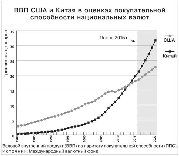 Станет ли Америка номером два?В курсе по национальной безопасности, который я читаю в Гарварде, лекция о Китае начинается с опросов. Прежде всего студентам предлагается сравнить Китай и Соединенные Штаты Америки – по показателям 1980 года и по нынешнему рейтингу. Снова и снова мои студенты демонстрируют шок от увиденного. Достаточно одного взгляда на диаграмму с цифрами 2015 года, чтобы понять причину этого шока.