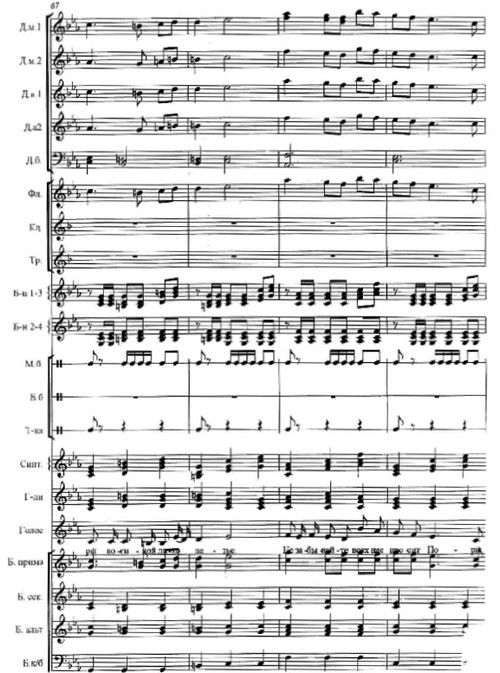 … Под золотым осенним солнцем на фоне бирюзового неба грустно стояли яблоня, груша-дичок и в багряных кистях рябина. Берёзки, словно часовые, замерли… Листва уже в позолоте. Яблоки с красными бочками и янтарные рясные (диалект – укр.) груши привлекали к себе внимание: они уцелели со времён войны… Ветки гнулись под тяжестью плодов, плоды осыпались на землю. А рябина, как будто роняла капли крови.