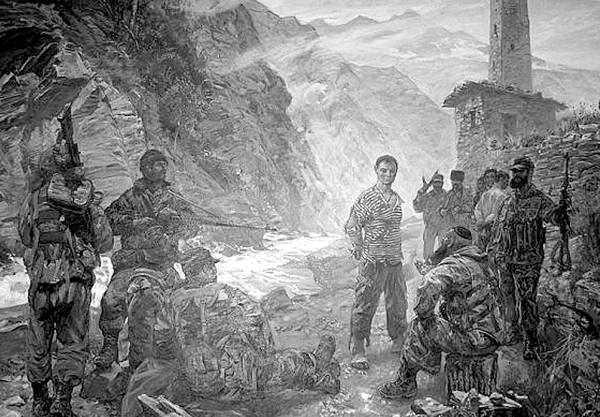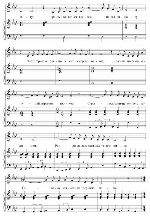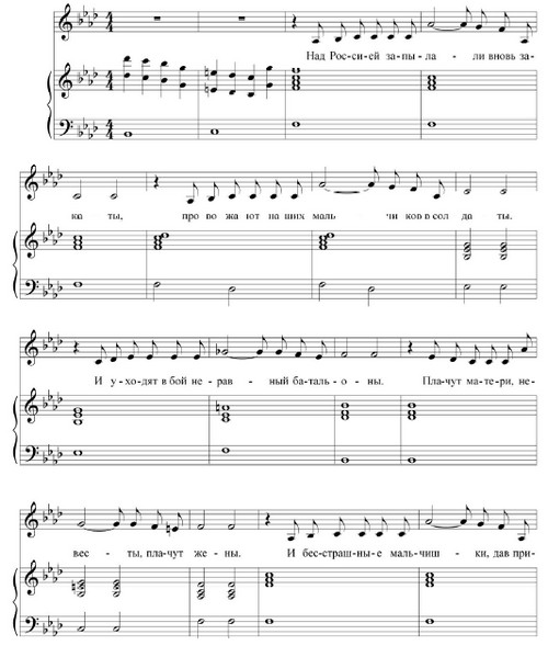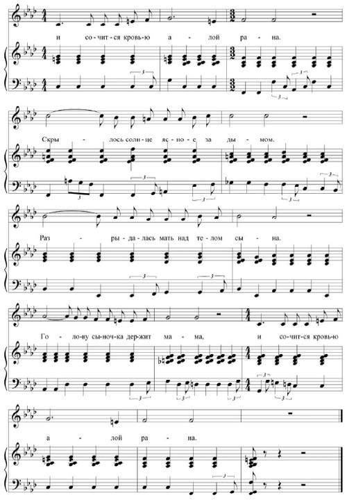 Над Россией запылали вновь закаты:Провожают наших мальчиков в солдаты,И уходят в бой неравный батальоны…Плачут матери, невесты… плачут жёны.И бесстрашные мальчишки, дав присягу,Прорываются вперёд, назад – ни шагу!Эхо горное разносит смерти хохот,Залпы тысячи орудий, взрывов грохот.Припев:Скрылось солнце ясное за дымом.Разрыдалась мать над телом сына.Голову сыночка держит мама,И сочится кровью алой рана…Громовые в небе слышаться раскаты.Не дождаться милой девушке солдата:Смертью храбрых пал жених её безусый, —Родниковые глаза и волос русый.Что же ты, война, с Россией сотворила? —Растравила все народы, разлучила:Полыхают над землёй моей пожары,Да гуляет ветер смерти, ветер шалый.Припев.