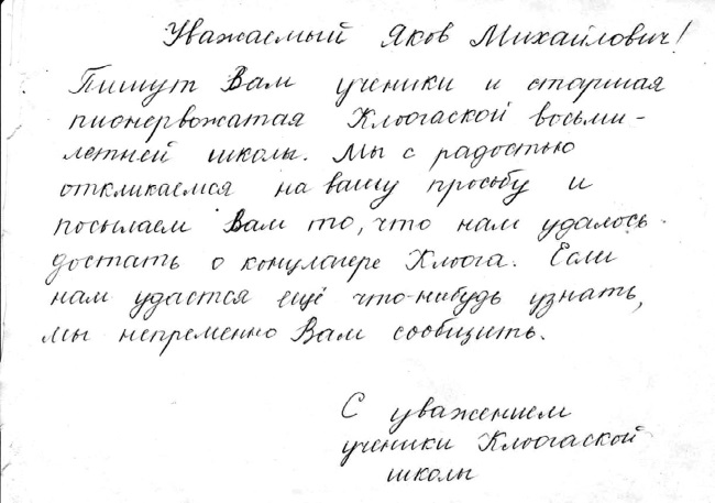 Этот материал печатался с подлинных документов. В числе этих документов «Акт о чудовищном преступлении гитлеровских захватчиков, совершённом в концентрационном лагере у железной дороги станции Клоога Эстонской ССР». Его прислали ученики Клоогской восьмилетней школы, они сняли копию этого акта, хранящуюся в музее, с таким сопроводительным письмом: