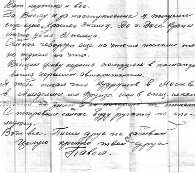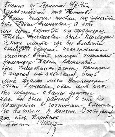 Я ваше получил письмо, не думайте, что Павел Алексеевич, а это мл. серж. Корж Ив. его ординарец Павел Алексеевич с того места, где вы вместе были, переведён в другое. И в другом несчастливом месте этот молодой энергичный командир был смертельно ранен. Примерно 6 апреля он скончался, очень мне жалко моего командира. Павел Алексеевич о вас мне как то говорил о вашей дружбе, как вы были ранены, и что вы находитесь в госпитале в Москве. Но на этом я кончаю. До свидания.