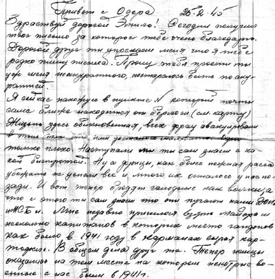 Я сейчас нахожусь в пункте N который почты самое ближе находится от берлоги (см. карту). Жизнь здесь обыкновенная, всех фрау эвакуировали, так что нам досталось маловато. Одно только плохо. Наступали мы ты сам знаешь с какой быстротой. Ну а фрицы как более нежная раса убежать не успели все и много их осталось у нас позади. И вот тепер бродят голодные как волки, а что с этого ты сам знаешь, что они пугают наши ДОПы и МСБы. Мне недавно пришлося взять майора и несколько капитанов в которых место гандонов как было в 1941 году в карманах сырая картофель. В общем дела друг те. Тепер немцы оказались на том же месте на котором некоторые военные с нас были в 1941 году.
