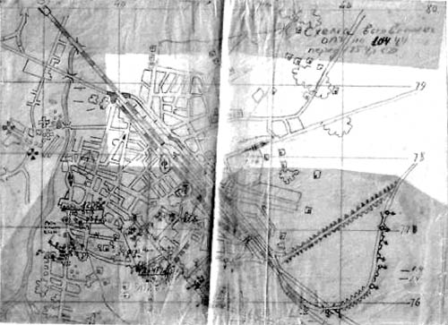 Карта. На кальке: Схема огневых точек противника перед позициями 175 Уральско-Ковельской стрелковой дивизии на 10.04.1944 г. (возможно 01.04.1944 г.). Возможно – это позиция перед крепостью Прага, предместьем Варшавы.