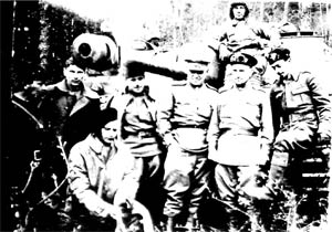 Вопрос к А. Солдатову: «Наверное, тебе тут кое-кто знаком: СКОРОБОГАТОВ, медик из нашей роты, фамилию не помню; нач. боепитания, БРИЖЕНЕВ – младший и отмеченный значком х – это я. Принимаю румын с их машинами Т-4. Я переводчик. Март 1945 г. Напиши фамилии, если помнишь. Подпись ВКрахт… (ВКУХТ…???)