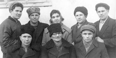 Парфентий Томаш с сыновьями и дочерью. Сидят слева направо: Максим, Парфентий Васильевич Томаш, Дмитрий. Стоят слева направо: Иван, Василий, Лидия, Андрей, Николай. В родном селе. 1960-е годы.