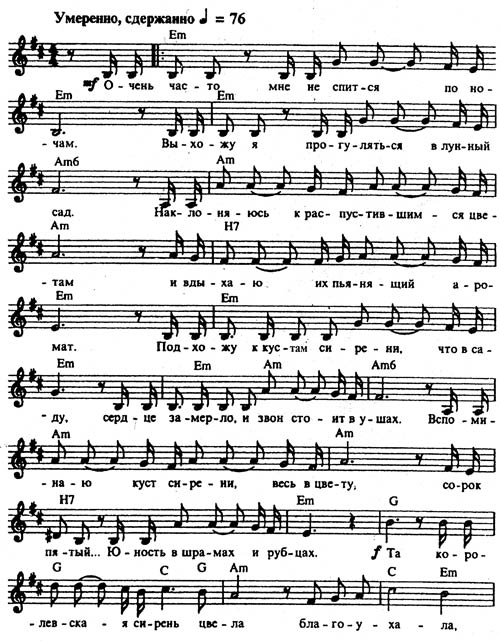 Очень часто мне не спится по ночам.Выхожу я прогуляться в лунный сад,Наклоняюсь к распустившимся цветамИ вдыхаю их пьянящий аромат.Подхожу к кустам сирени, что в саду,Сердце замерло, и звон стоит в ушах.Вспоминаю куст сирени, весь в цвету,Сорок пятый… Юность в шрамах и рубцах!Припев:Та королевская сиреньЦвела-благоухала,О том, что кончилась война,Сирень еще не знала.Возвратилась я с войны – грудь в орденах,Ладно скроена, красива, молода…О таких мечтают парни в мирных снах,Но на долю мою выпала беда.Командир полка, что был в меня влюблен,Смертью храбрых пал в последний день войны.Снова вздрогнет тихо память – слышу звон:Я с сиренью на могиле у сосны…Припев26 декабря 1999 г.