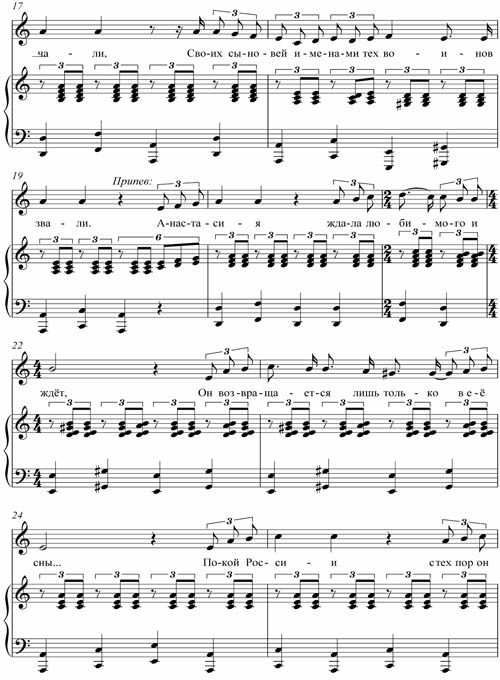 2. Плакали, пели, шумели метели,И чёрные косы снегами блестели.Вырос Павлушка – отца никогда не узнает.Вдова с головы чёрный плат никогда не снимает.И Родине внуки долг с честью отдали,А правнуки – в школу уже пошагали.Та же улыбка в них, голос и нежные взгляды.Так верит вдова, что любимый всегда с нею рядом!Припев.
