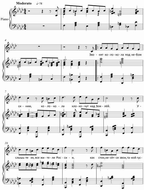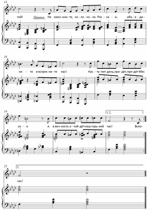 1. Звонят колокола под небом синим.Колокола клокочут над Землёй!Услышьте их, все жители России! —Как стон, несётся звон – такой густой.Припев: Не смолкните, колокола России,Объедините и встряхните нас!Наступит день – придёт, придёт Мессия,И в вечность отойдёт наш горький час!2. Всполошный звон взлетает над страною —Услышьте все, кто от неё вдали:Кто юн и кто увенчан сединою —Ведь Родину забыть вы не смогли.Припев.3. Пройдитесь по полям моей России.Какие складки горя пролегли!Озёра, реки плачут от бессилья,Повсюду ветры смерти залегли.Припев.