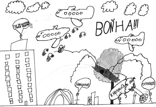 Отсылаю Вам два рисунка, они составят диптих: от младшего внука рисунок – констатация того, что творит с детьми война; а второй – от старшей, уже осмыслившей все последствия этого ужаса уничтожения, плакат-предостережение от будущих войн или ПРОТЕСТ. Как Вы правильно написали – напоминание о том, что не будет детей – не будет и жизни. Именно, вопрос тем, кто разжигает войны. С уважением, целую, Е. В.»…